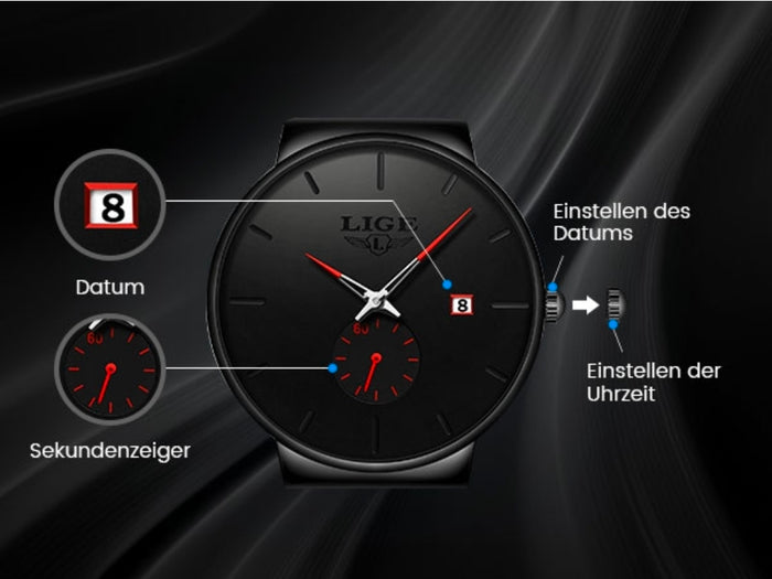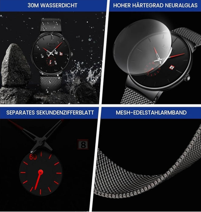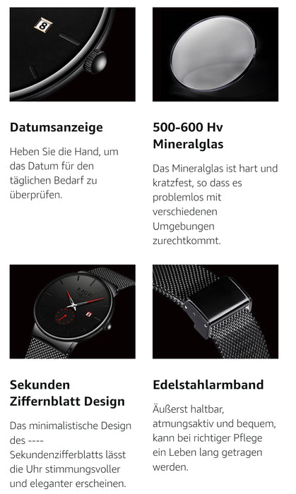 High-quality material, comfortable to wear: the bracelet and case of these men's watches are made of high-quality stainless steel, and the adjustable strap adapts to different wrist circumferences and combines durability and comfort. The watches for men come with a scratch-resistant mineral glass (500-600 Hv on the Vickers scale) for extra durability and long-lasting clarity