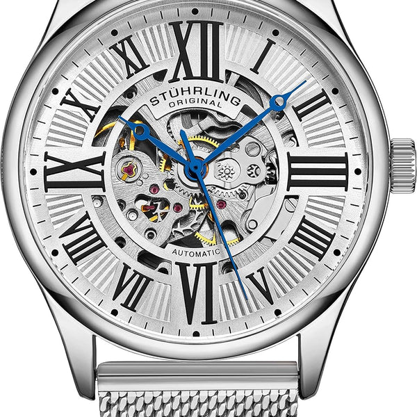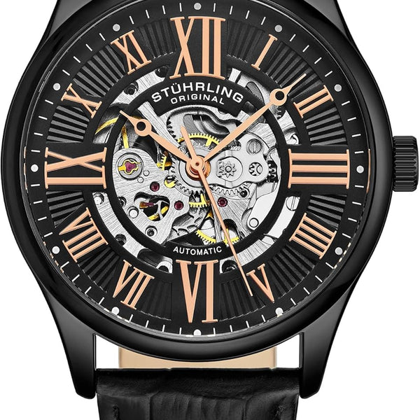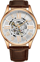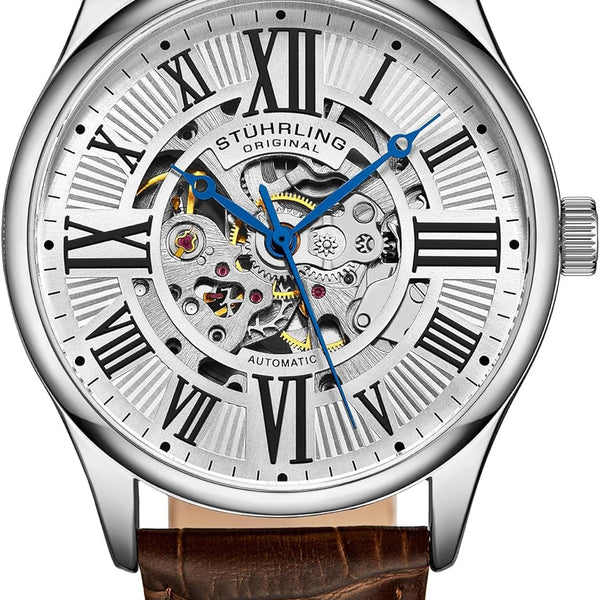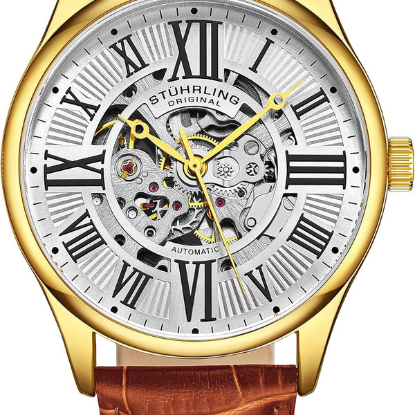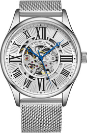 Diese Stuhrling Herren-Armbanduhr ist neu mit Etikett und verfügt über ein mechanisches (automatisches Aufziehen) Uhrwerk.    Sie ist in klassischem, formellen Stil gestaltet und verfügt über ein skelettiertes Zifferblatt mit...