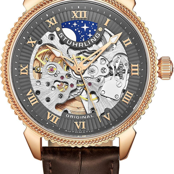 Lassen Sie Ihre Marke mit dem Stuhrling Special Reserve 835. Bekannt für seine Extravaganz und Komfort, diese Uhr ist in Handarbeit mit einem bezaubernden Mondphase Funktion sicher zu intrigen sogar...