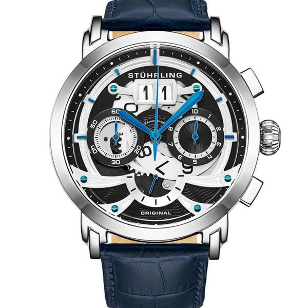 ✨ Stührling Original Herren Chronograph – Elegantes Skelett-Design & Blaues Lederband Marke: Stührling Original Modell: Herren Chronograph Gehäusematerial: Edelstahl Armband: Blaues Lederband (Krokodilprägung) Zifferblatt: Skeleton Design mit blauen Akzenten Funktionen:...