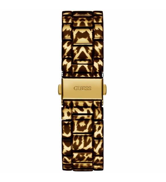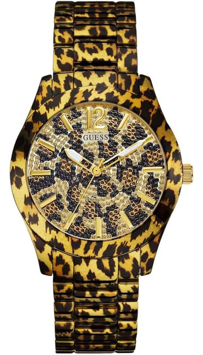 Glitzerndes Zifferblatt mit Leopardenmuster; goldfarbene Zeiger und volle Markierungen
